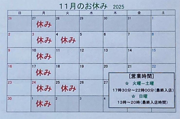 2025/10/312025年11月のお休み予定をアップ致します。 営業時間は、 日曜日は13時〜20時(最終入店時間)、 火曜日〜土曜日は17時30分〜22時(最終入店時間) となります。 11月も『平日ドリンク早... -