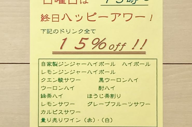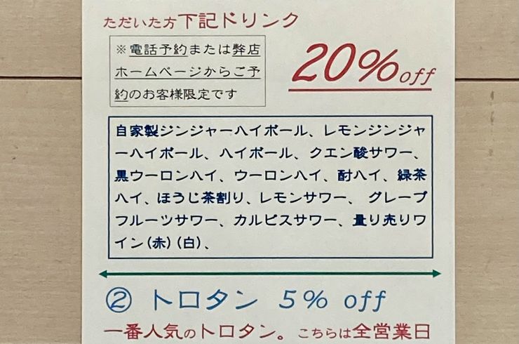 2024/05/21今月もやってます『平日早割』! 人気の自家製ジンジャーハイボールやサワー系、量り売りワインが通常の20%引きです。 当日でも構いませんので、お電話か弊店のホームページからご予約ください。 ... -