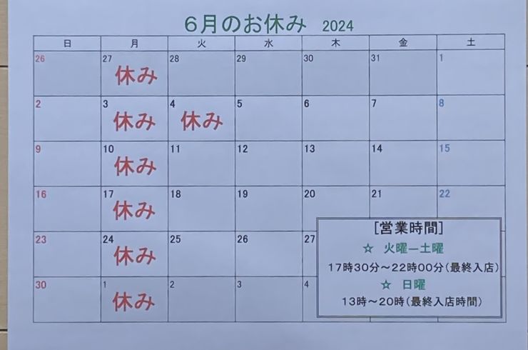 2024/05/312024年6月のお休み予定をアップ致します。 6月も『平日ドリンク早割』『日曜終日ハッピーアワー』、引き続きやります! お電話または弊店ホームページよりご予約お待ちしてます。 本日5月最終... -