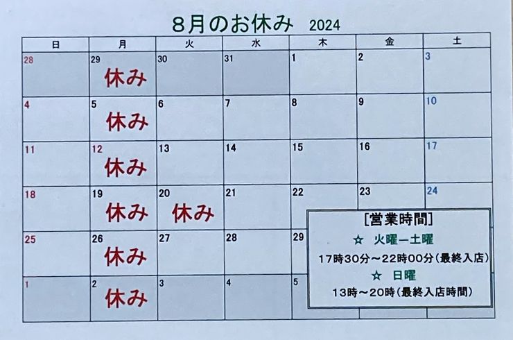2024/08/09あらためて2024年8月のお休み予定をアップ致します。お盆期間中も特に夏休みは取らず通常営業の予定です。 今日、明日の連休始めは移動日の方が多いのか例年お客様少ないです。明後日日曜はほぼ終日満席... -