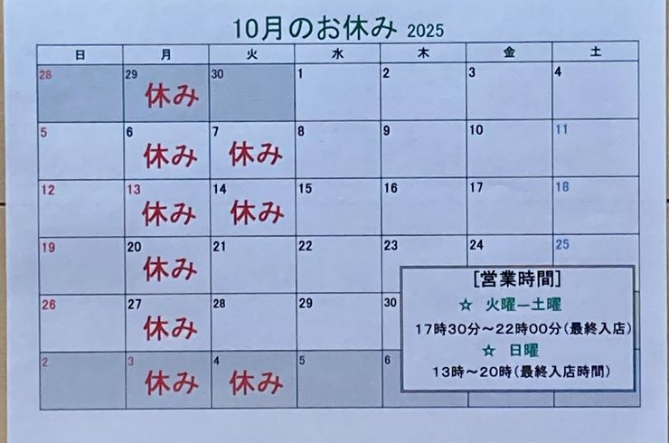 2025/09/302025年10月のお休み予定をアップ致します。 営業時間は、 日曜日は13時〜20時(最終入店時間)、 火曜日〜土曜日は17時30分〜22時(最終入店時間) となります。 10月も『平日ドリンク早... -