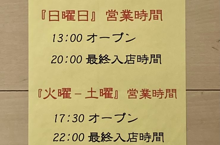2025/10/01あらためまして営業時間のご案内です。 火曜日〜土曜日は17時30分(開店)〜22時(最終入店時間) 日曜日は13時(開店)〜20時(最終入店時間) となります。 最終入店時間ギリギリに入られ... -
